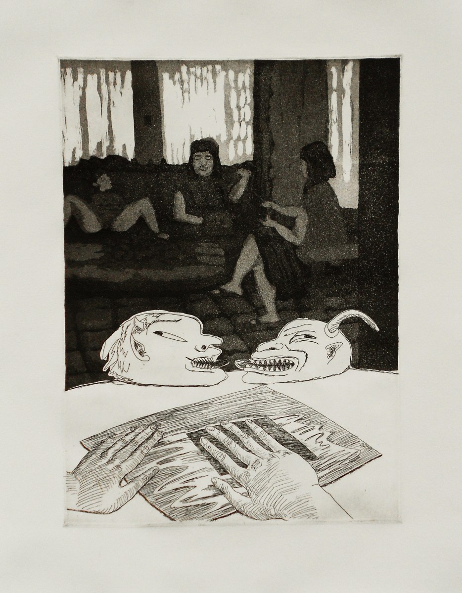 hilanderas Publicado octubre 19, 2013 en 2321 × 2981 en Grabado ← Anterior Siguiente → «Hilanderas», 2012, mezzotinta, 40×30 cm.