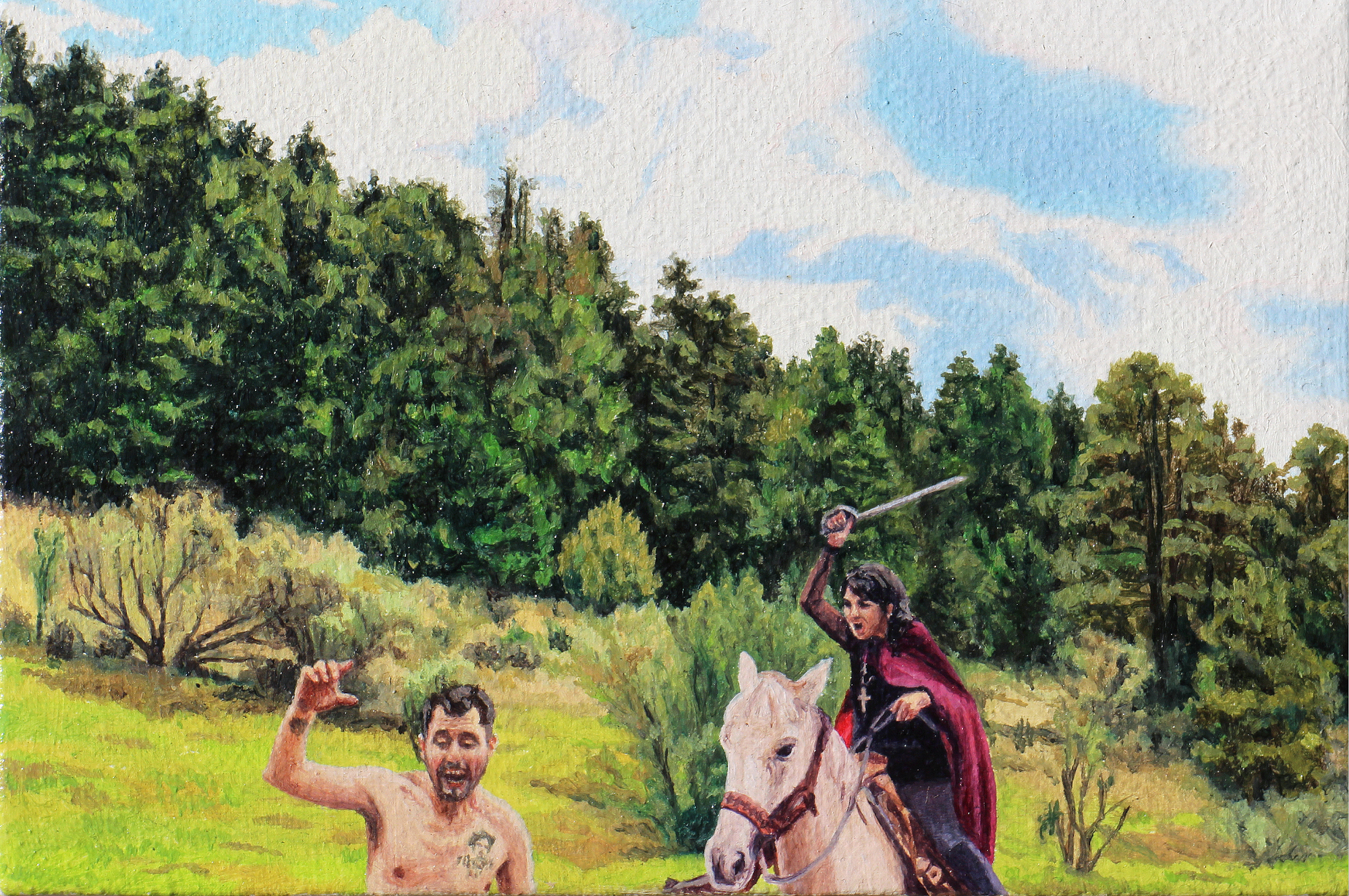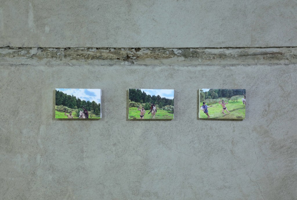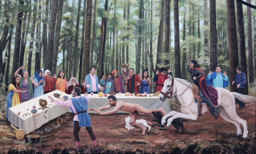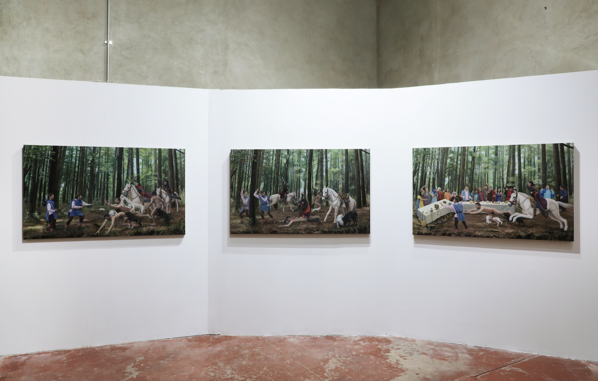 Debemos observar ahora qué operaciones ha realizado Julián Madero para abordar este relato. En concordancia con procesos pictóricos pasados, Madero ha convocado a un grupo de amistades y familiares con quienes replantear estas extrañas circunstancias. La jinete, Nastagio, el amado, lxs comensales del banquete, lxs personajes han caído en distintas posiciones en relación a su acuerdo original y las imágenes que informan estas pinturas no son las tradiciones del disegno en la escuela florentina, sino collages armados de fotografías y panoramas tomados en exteriores de la Ciudad de México.