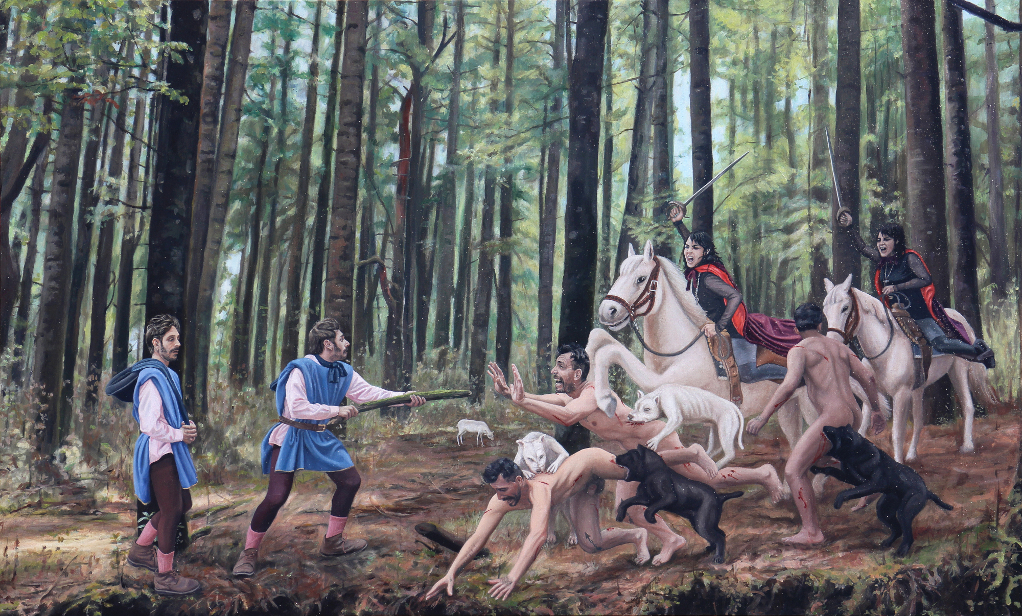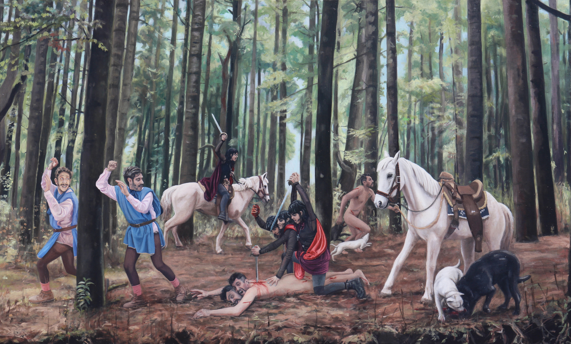 Las pinturas, sin embargo, representan los acontecimientos nuevamente en el mismo carácter holográfico y simultáneo que los fantasmas de Botticelli, dándonos múltiples eventos en una sola escena; secuencias simultáneas y la sugerencia de movimiento. Con este repertorio de actrices y actores surge una nueva posibilidad para la representación de este relato. En lo que parece ser una hipérbole de los eventos, aparece un tipo de set pintado a detalle, sobre grisalla, cuyos precisos colores animan los atavíos, la vegetación y el pelaje de los seres. Algunos, un cervatillo y un perro medieval, se han colado desde las figuras del siglo XV.