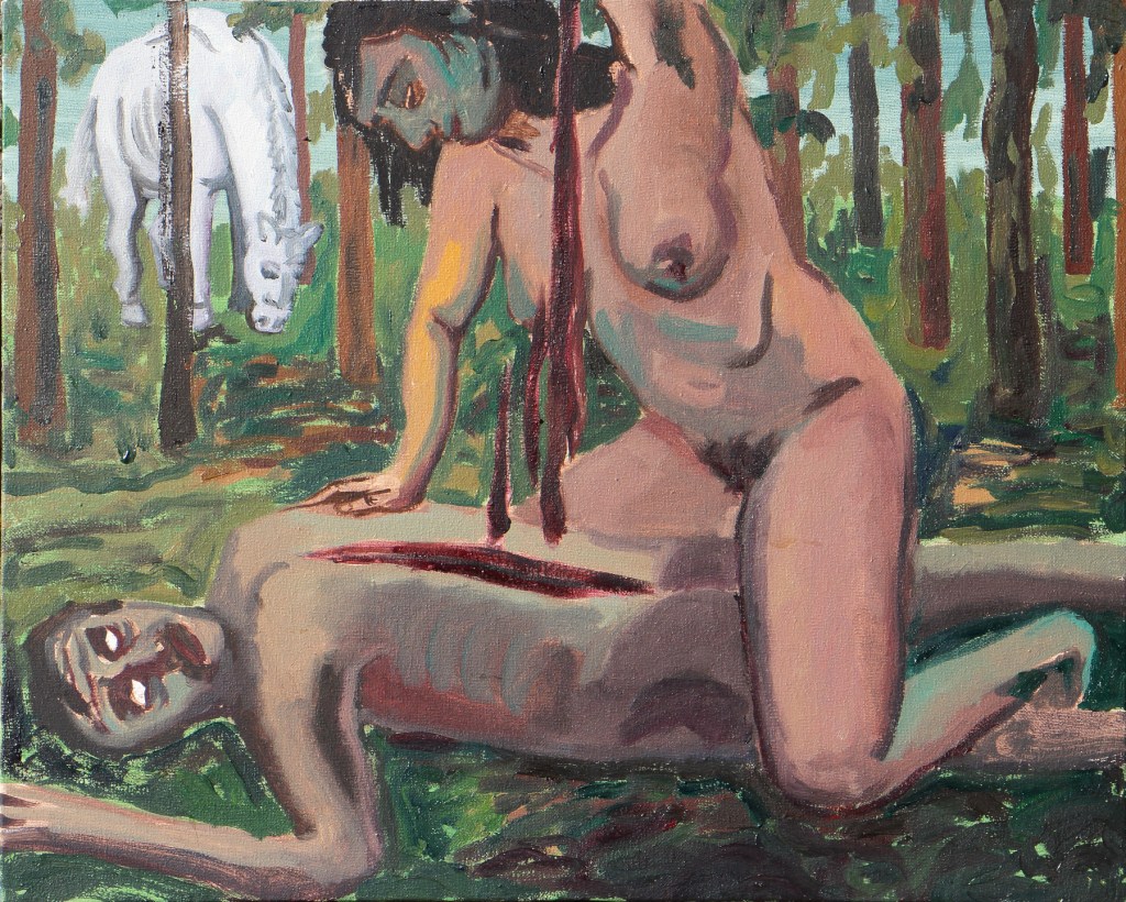Las obras presentes nos hacen pensar también en los experimentos que el arte ha organizado desde sus signos y violencias históricas en todos los ámbitos, no menos el amor romántico binario, que su propia tragedia. Sin atrevernos nunca a señalar que la crueldad de una obra puede ser suspendida por otra, las advertencias de Núñez y Huberman se ensayan en y ponen a prueba a la pintura de Julián Madero, que en esta ocasión recorre –con todos sus recursos– sus distintos pronósticos y su constante apetito de inmersión en la pesadilla que a veces es la historia de la pintura.
