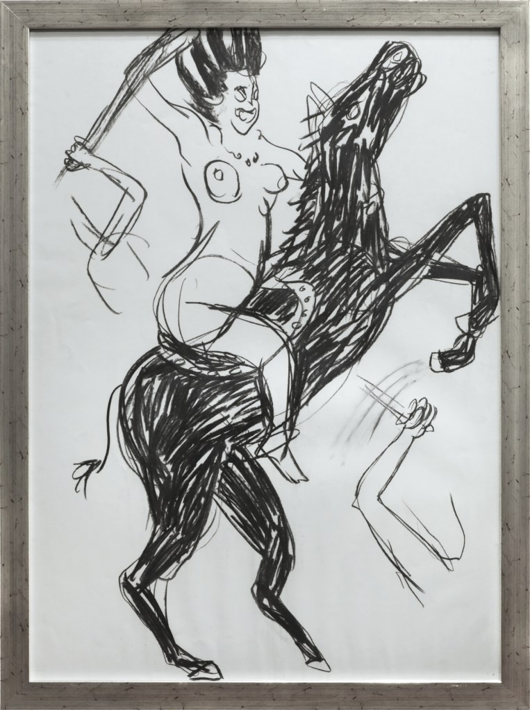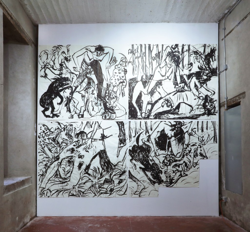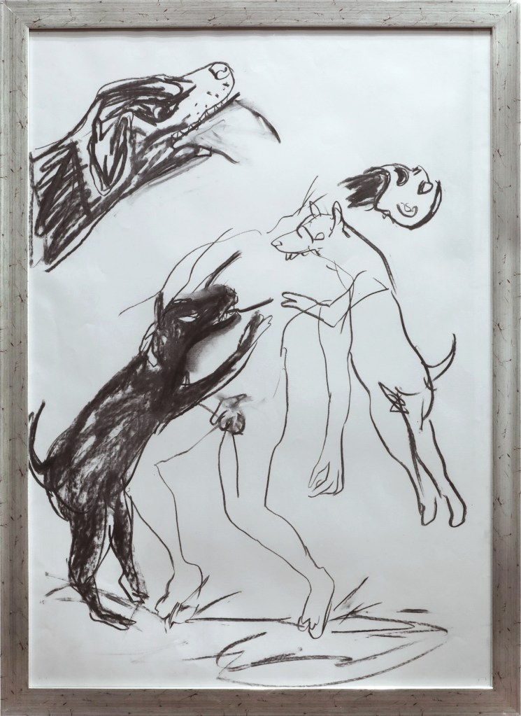 Acompañando a estas pinturas, vemos también una serie de cuatro dibujos en gran formato llevados a cabo en tinta sobre papel y formados en cuatro secciones montadas por módulos. Aquí, todavía bajo una inversión de personajes, se reactiva la pesadilla del relato de Nastagio y sus implicaciones para algo que también está más allá de la ficción. En este enramado se sacuden violentamente cuerpos humanos femeninos y masculinos así como los de caballos y perros. Humana / humano / perro / caballo en eterno conflicto. Este segmento de la muestra nos recuerda que el trabajo de Julián Madero no posee un tipo permanente de mirada: cuando pensamos que su obra ha sido contenida en el panorama coloreado de la escena, ha de volver el virulento suplicio que motiva muchas de sus persecuciones, y que es también la sombra que anima su pintura.